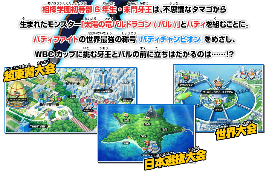 相棒学園初等部6年生・未門牙王は、不思議なタマゴから生まれたモンスター「太陽の竜バルドラゴン(バル)」とバディを組むことに。バディファイトの世界最強の称号『バディチャンピオン』をめざし、WBCカップに挑む牙王とバルの前に立ちはだかるのは……!?