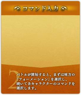 • 【コマンド入力】バトルが開始すると、まずは味方の「フォーメーション」を選択し、続いて各キャラクターのコマンドを選択します。