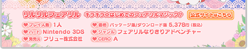 リルリルフェアリル キラキラ☆はじめてのフェアリルマジック♪ / 2016年11月10日(木)発売 タイトル:リルリルフェアリル キラキラ☆はじめてのフェアリルマジック♪ プレイ人数:1人 ハード:Nintendo 3DS パッケージ版・ダウンロード版 価格:5,378円(税込) 発売元:フリュー株式会社 ジャンル:フェアリルなりきりアドベンチャー CERO:A