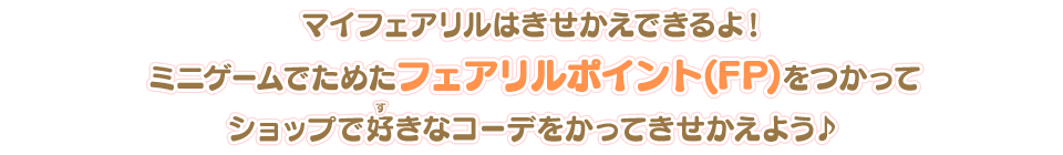 マイフェアリルはきせかえできるよ!ミニゲームでためたフェアリルポイント(FP)をつかってショップで好きなコーデをかってきせかえよう♪